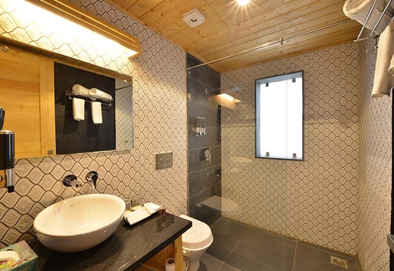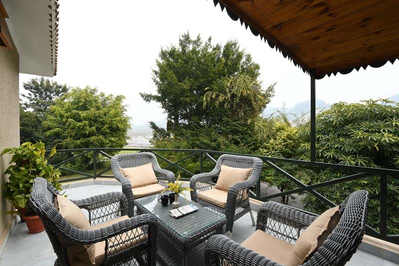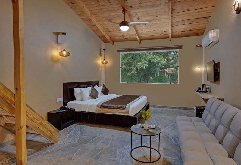 Sarang Family Rooms feature a king-size bed and a dedicated Machan for kids, offering a comfortable and family-friendly space. Each room includes a balcony or private sit-out area, with the option of enjoying a peaceful garden view. The room elegantly blends modern artistic design with essential home comforts and conveniences, ensuring a relaxing and memorable stay for all.
